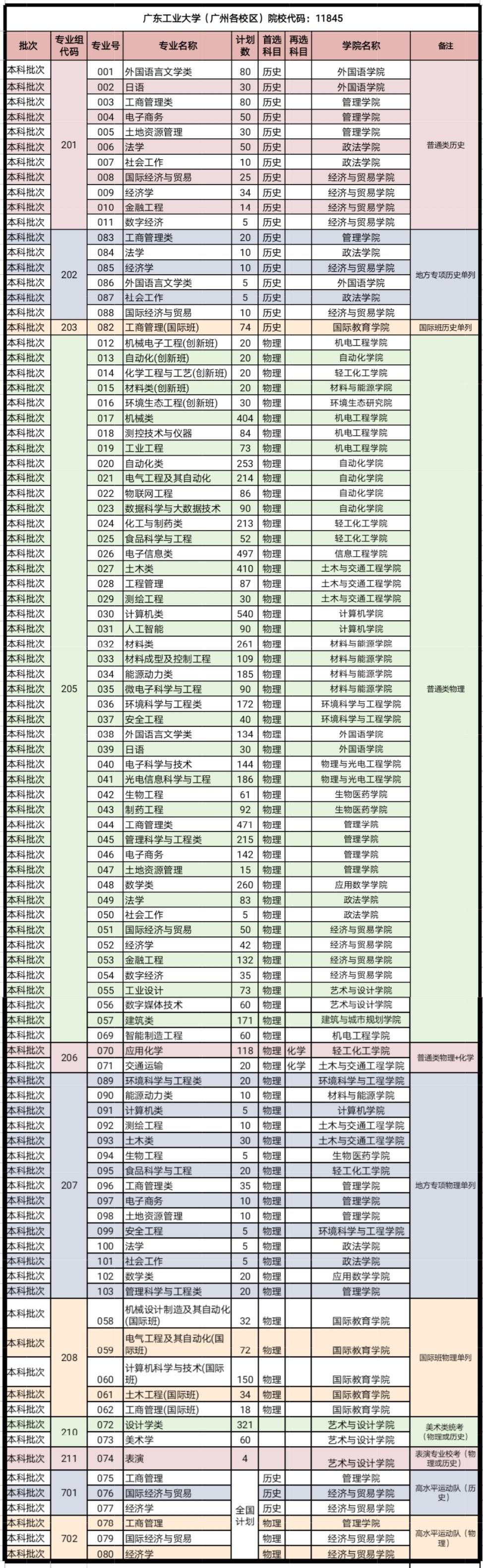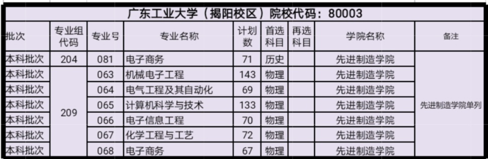 广东省计划中,物理类计划7759名,历史类计划613名、艺术类计划385名,设置13个院校专业组进行招生,其中揭阳校区(先进制造学院)单列院校代码开始首年招生。