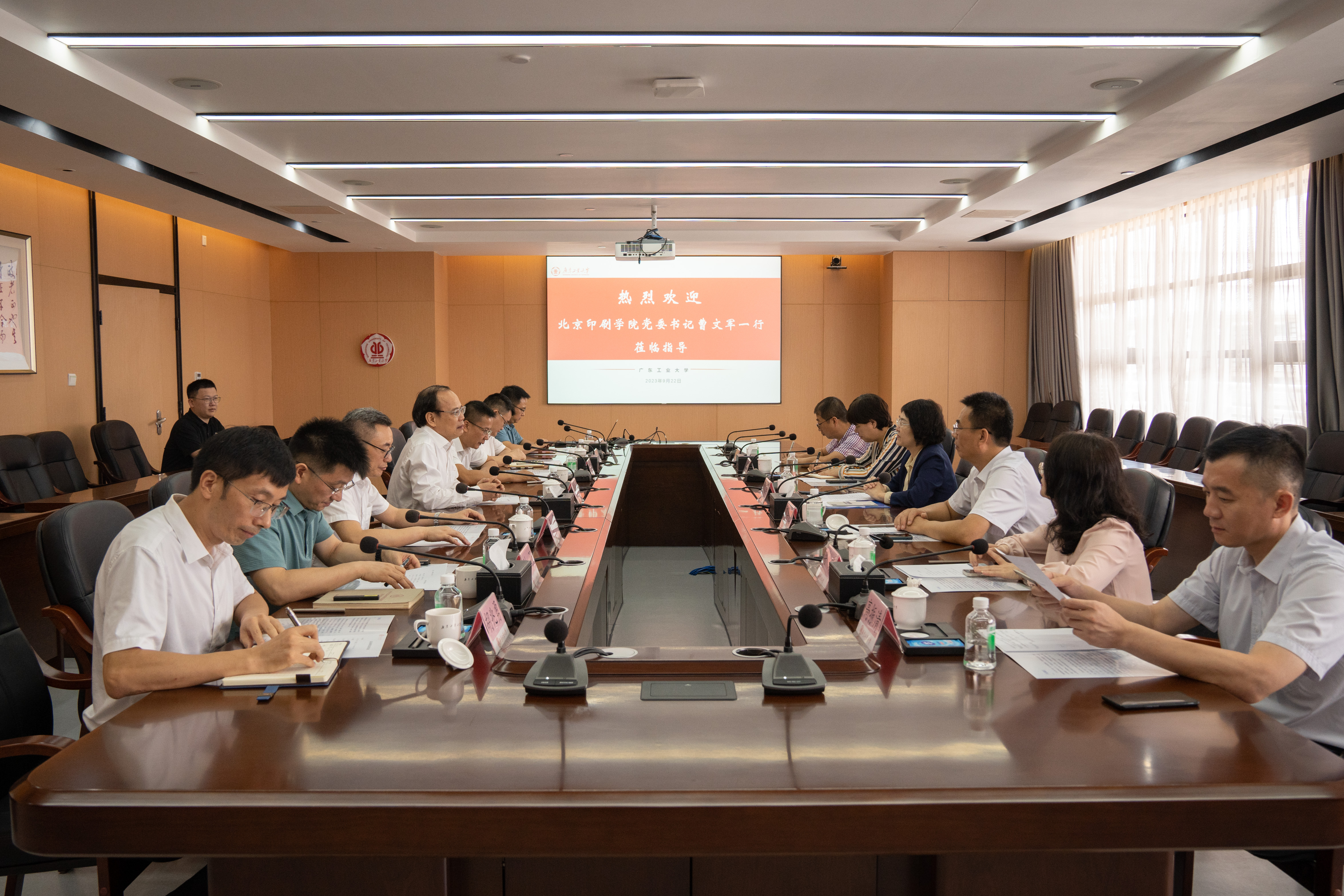 9月22日上午,北京印刷学院党委书记曹文军,党委常委、副院长刘尊忠一行到学校调研交流。校长邱学青,校党委常委、副校长鲁仁全,机关党委、发展规划处、科学研究管理部、机电工程学院等相关负责人参加座谈,双方在行政楼702会议室会谈交流。