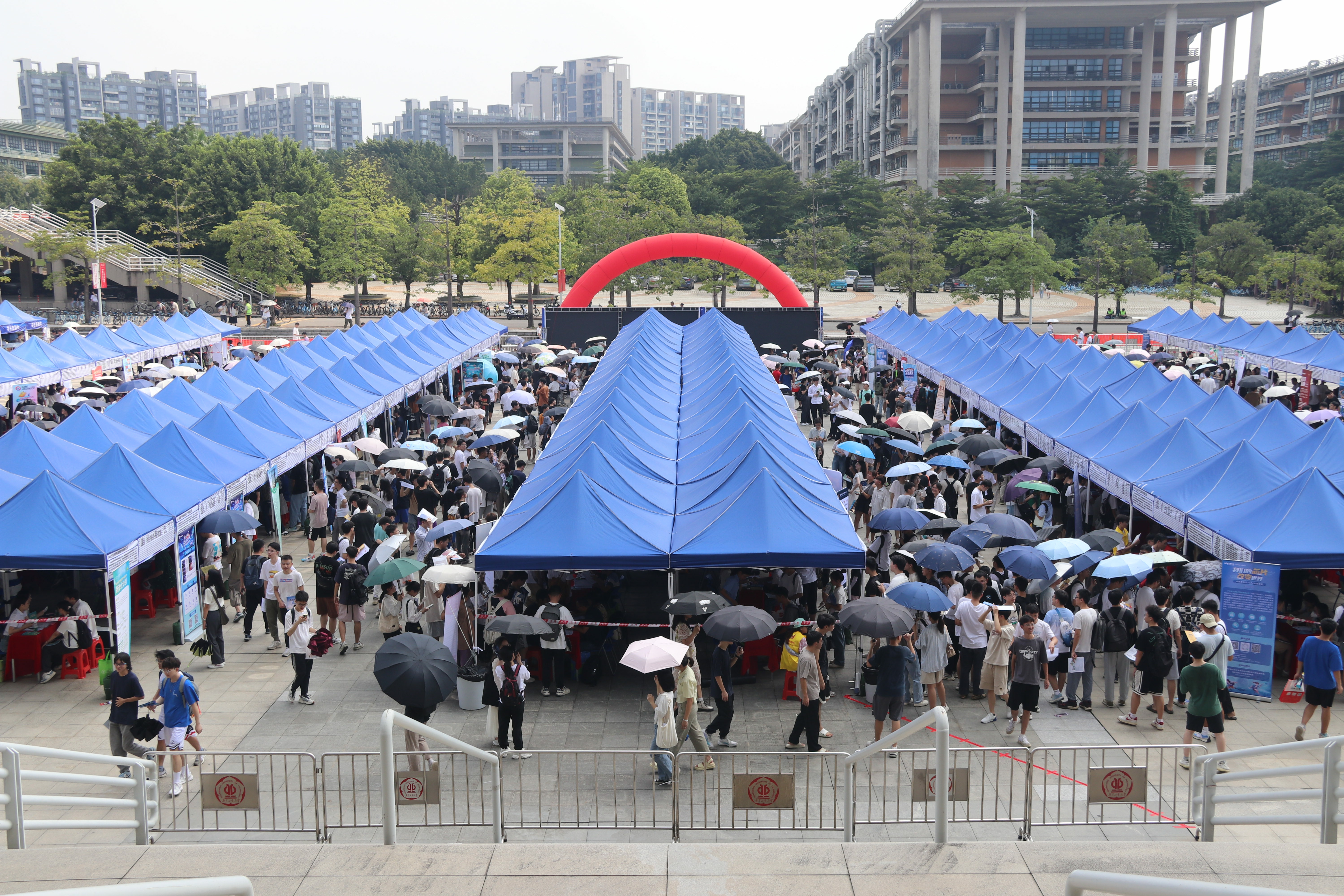 9月23日在大学城校区图书馆架空层举办“名企组团金秋促就业丨乐玩LE WIN(中国)2024届毕业生秋季校园双选会”。这是本学期入学以来首场线下毕业生与用人单位大型供需见面会,共吸引了广汽、中建、厦门建发股份有限公司、中国电信股份有限公司广东分公司、上海宝冶集团、中国能源建设集团、海信、粤海水务、TCL、兴业银行、多益网络有限公司、蓝月亮(中国)有限公司、深信服科技股份有限公司等共计307家单位,提供优质岗位近12000个,近7000名毕业生参加本次供需见面活动。党委学生工作部、保卫部等相关部门负责同志和学生就业指导中心工作人员深入现场了解用人单位需求与毕业生求职动向,为促进毕业生更充分就业牵线搭桥。