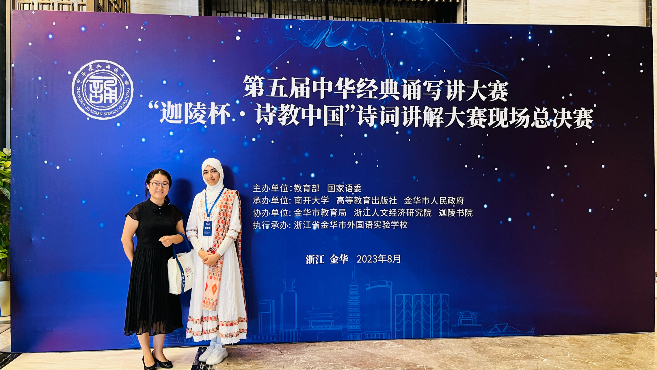 近日,在第五届中华经典诵写讲大赛“迦陵杯•诗教中国”诗词讲解大赛总决赛中,2021级英国籍本科生HADIAH SALAH(指导教师:李娟)获得留学生组全国二等奖。这是我校国际学生在此项赛事获得的最佳成绩。