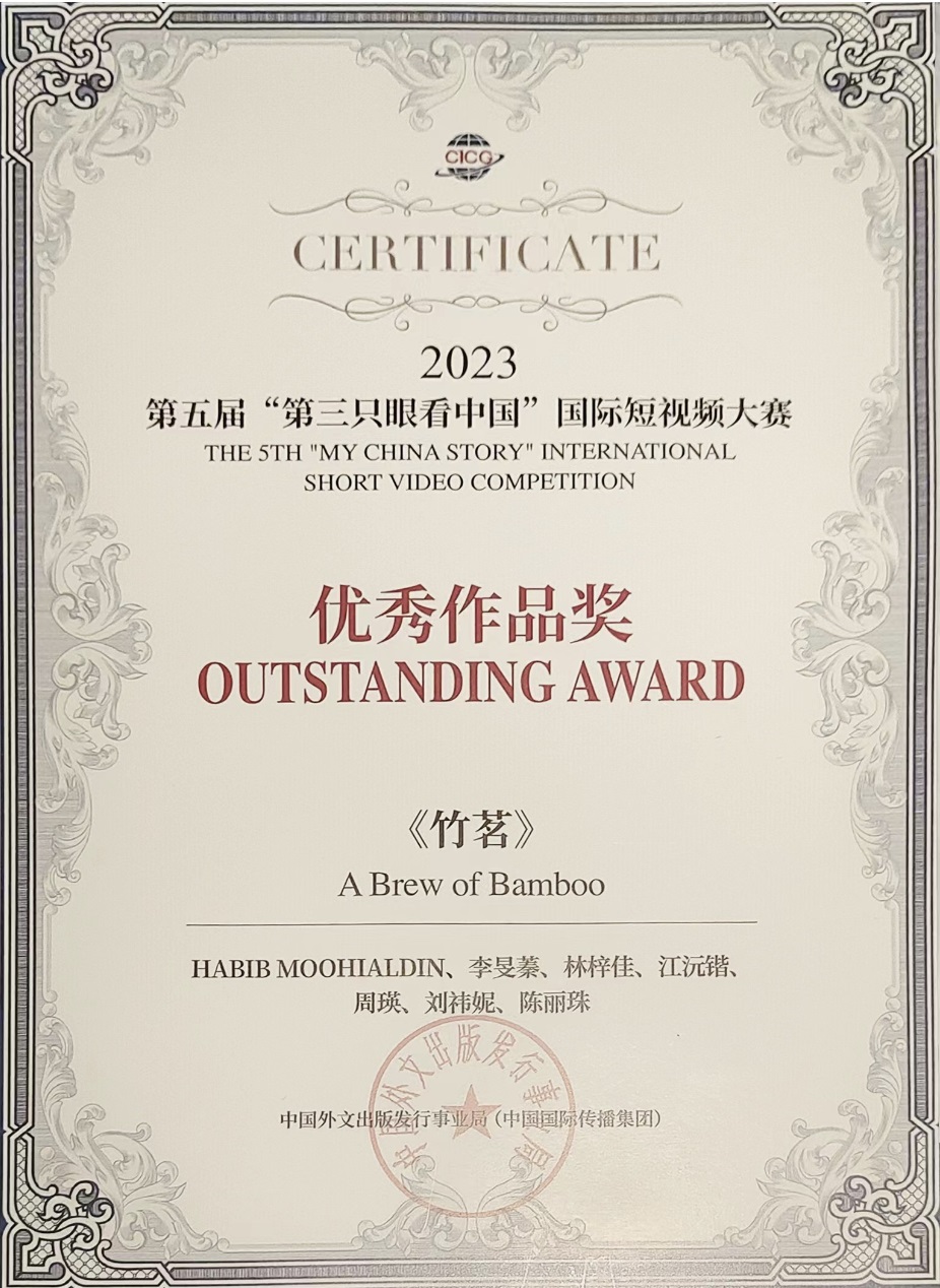 由全球领先的电竞赛事平台国际交流学院也门籍学生MOOHIALDIN BA HABIB ALI ISMAIL(碧海)和肇庆学院学生林梓佳、李旻蓁等人共同创作的影片《竹茗》在2023年第五届“第三只眼看中国”国际短视频大赛中脱颖而出,荣获优秀作品奖。