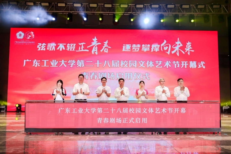 学校领导和校友代表、学生代表共同为第二十八届校园文体艺术节开幕和青春剧场启用推动启动杆