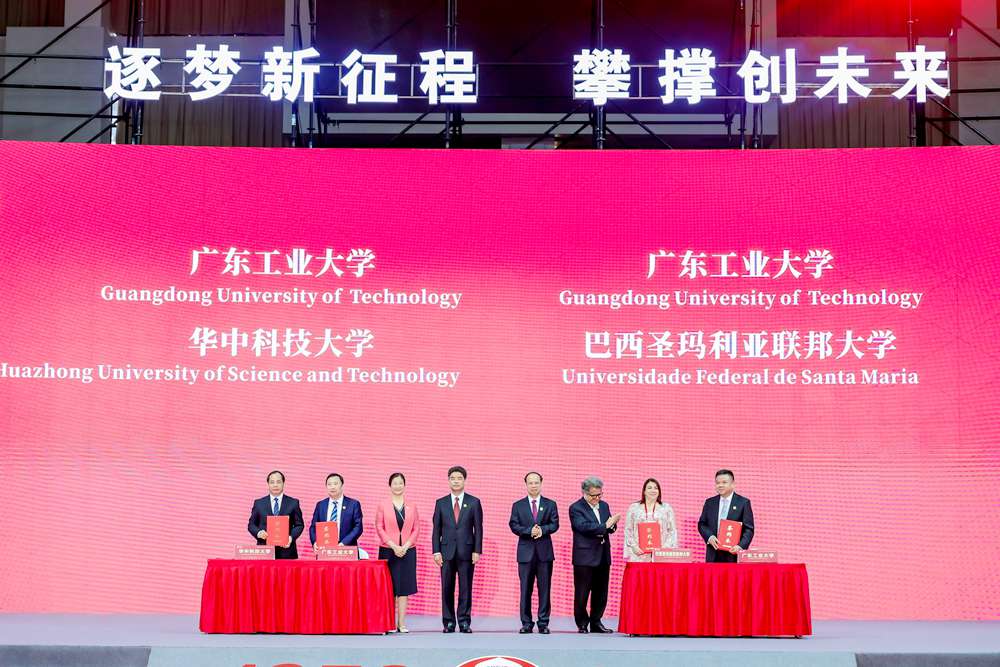 学校党委常委、副校长杜承铭,副校长余林分别与华中科技大学党委副书记张耀、巴西圣玛丽亚联邦大学副校长玛莎·博勒·阿黛梅进行校校合作签约,胡钦太、邱学青、学校党委副书记朱蔚蔚与巴西联邦共和国驻广州总领事馆总领事艾伦·科埃略·德塞洛斯共同见证仪式。