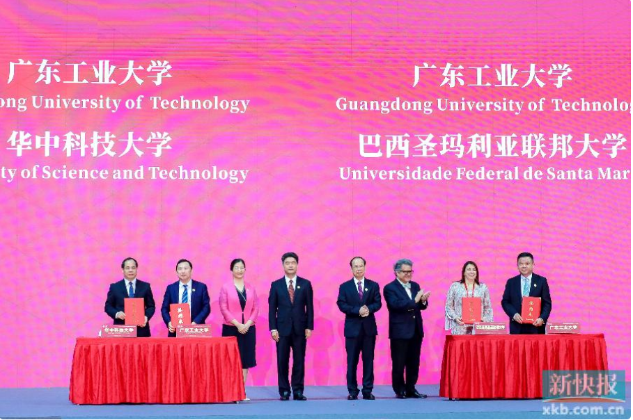 学校党委常委、副校长杜承铭,副校长余林分别与华中科技大学党委副书记张耀、巴西圣玛丽亚联邦大学副校长玛莎·博勒·阿黛梅进行校校合作签约,胡钦太、邱学青、学校党委副书记朱蔚蔚与巴西联邦共和国驻广州总领事馆总领事艾伦·科埃略·德塞洛斯共同见证仪式。