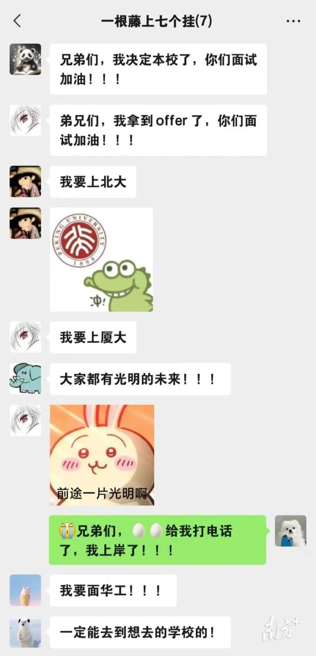 7个人因为共同的保研目标走到一起,成为志同道合的朋友。他们建了一个名为“一根藤上七个挂”的群名,寓意兄弟齐心,一起“开挂”。在准备保研期间,他们携手并进、互相鼓励,一起参加比赛、共享院校信息,在焦虑、迷茫时互相安慰,最终实现全员成功保研。