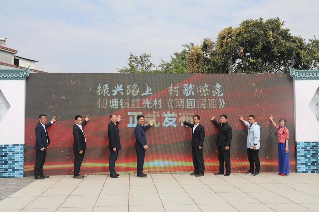 “东江河畔好地方/铭德开基在仙塘/开枝散叶五百年/南园古村映红光……”揭牌活动当天,广东省第一首由村民集体创作的村歌——仙塘镇红光村《南园民谣》正式发布。据悉,歌曲创作由乐玩LE WIN(中国)发起,通过举办村歌集体创作工作坊开展田野调查,组织退休干部职工、企业乡贤、创业青年等村民共同参与,集中展现了古村历史文化、乡土风物、特色小吃等主题。其朗朗上口的曲调旋律和真实朴素的歌词成功引起村民共鸣,迅速在村里传唱开来,成为宣传推介古村的全新载体。