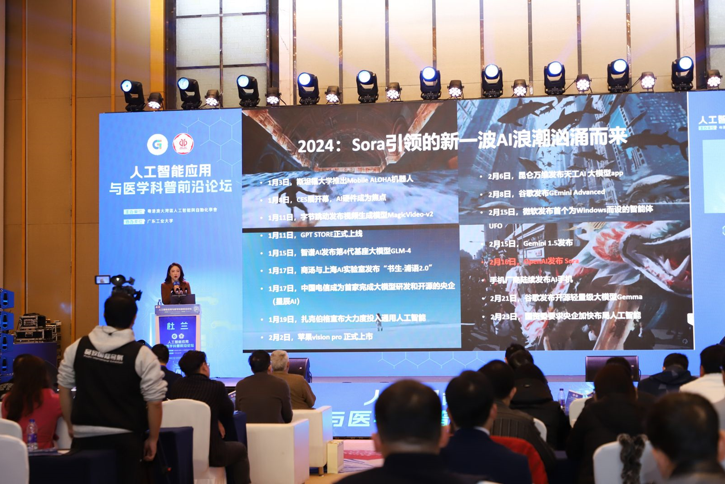 在嘉宾论坛上,广东省人民医院肿瘤医院副院长王坤教授带来了主题为《人工智能在医学领域中的应用与创新》的演讲,详细介绍了AI在疾病诊断、治疗决策、康复护理等方面的优势和潜力,并分享了其在广东省人民医院肿瘤医院的应用案例。广西医科大学教务处副处长程继文教授分享的《交互式虚拟数字医生在科普与诊疗全流程管理中的实践与创新》,通过生动的案例展示了AI技术在医学科普领域的广泛应用前景。广东省人工智能产业协会会长杜兰女士发表了题为《大模型落地应用的机遇与挑战》的演讲,从行业发展的角度,深入分析了AI大模型在落地应用中面临的机遇和挑战,为参会者带来了新的思考和启示。