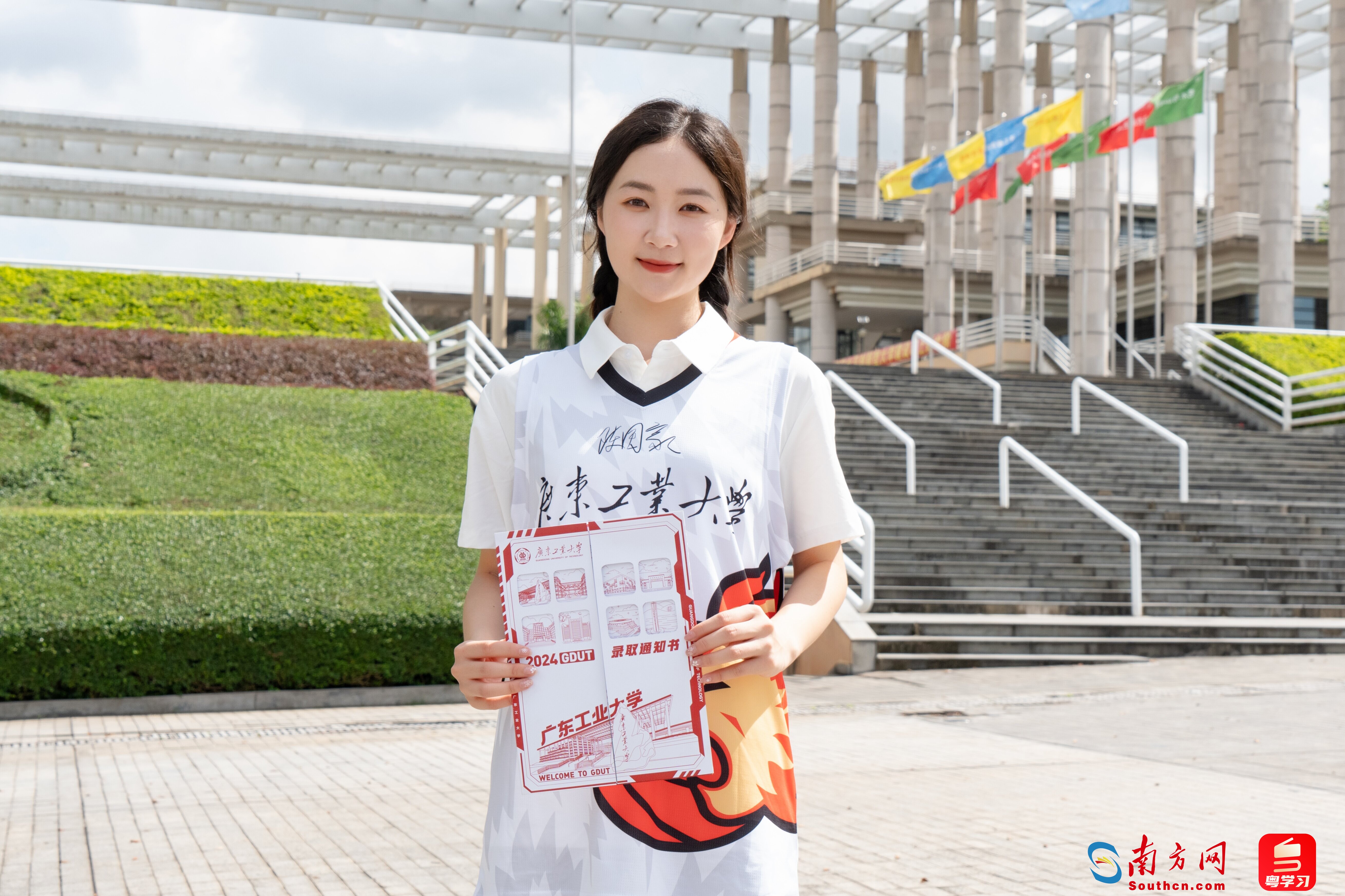 新款录取通知书分为封套和内页两部分。封套为开门开窗式设计,对应内页六大校区手绘标志性建筑,展现校区各有特色、协同发展。打开封套,右侧展示学校“与广东崛起共成长,为广东发展作贡献”的办学理念。
